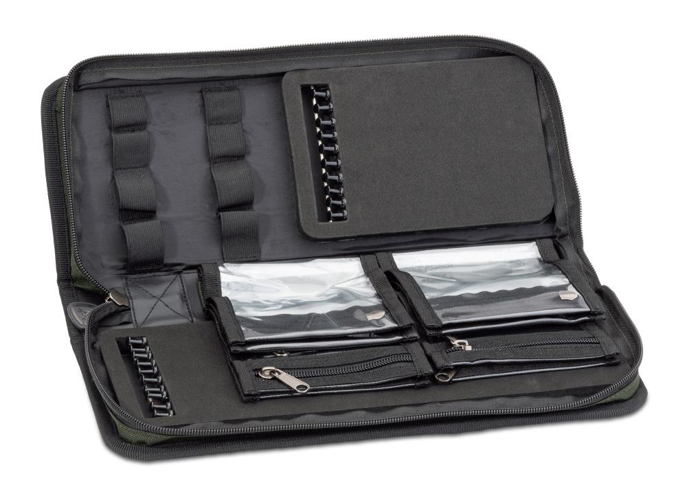 Dieses mit einem kurzen und einem extra langen Rig Board ausgestattete Wallet beinhaltet zusätzliche 8 Klarsichthüllen zum Aufbewahren von Braids, gebundenen Rigs oder anderen Accessoires. Selbstverständlich ist die Tasche mit ausreichend Pins zum Befestigen der fertigen Montagen bestückt. Der Innenraum der Tasche enthält 8 elastische Gummibänder zum Einhängen von Boilienadel, Bohrer oder ähnlichem.
