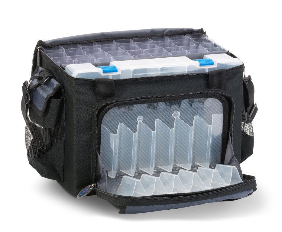 Dies ist die ultimative Tasche wenn es darum geht, betreffend seiner Köderwahl sehr flexibel zu bleiben. Im Hauptfach befinden sich neben einer großen Köderbox (36x23,5x8cm) auch 36 Einhängevorrichtungen für Pilker etc. Zudem ist in der Vortasche noch eine Möglichkeit vorhanden noch weitere kleine Köder unterzubringen. Das Deckelfach beinhaltet Klarsichthüllen für z.B. Vorfächer. Zwei seitlich angebrachte Außentaschen runden das Platzwunder ab. Natürlich fehlen auch hier Tragegriffe und ein Schultergurt nicht.