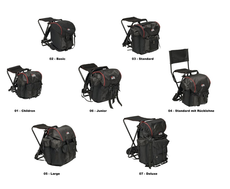 Qualitativ hochwertige Rucksäcke mit integriertem Klapphocker in unterschiedlichen Ausführungen und Größen. Auch für die kleinen Angler und Abenteurer ist der passende Rucksack vorhanden.