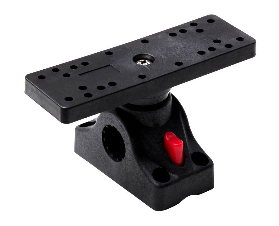 Halterung für einen größere Fischfinder, mit einer mehrfach gemusterten Deckplatte. Passt für die meisten - aber nicht alle - Fischfinder: Sie müssen möglicherweise Löcher bohren, um einige von ihnen zu montieren. Dreht sich um 360 Grad, in kleinen Schritten. Passt auf die DAM®-Rutenhalterung, die direkt auf jede ebene Fläche geschraubt werden kann (oder auf die DAM®-Klebebefestigung für die Verwendung auf einem Beiboot oder Belly Boat).