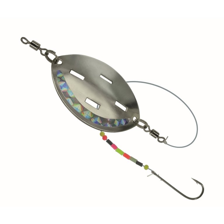 Dies ist ein Locklöffel zum Plattfisch- und Meeresangeln. Am Löffel ist ein komplett fertiges Vorfach (Wirbel, Haken, Schnur sowie Leuchtperlen) bereits montiert. Die unterschiedlichen Farbvarianten sowie die Leuchtperlen erhöhen den Lockreiz auf die Fische. Er wird wie folgt angewendet: Den Löffel absinken lassen - Rutenspitze anheben und 2-3 Rollenumdrehungen einholen und wiederholen. Die dabei entstehende ,Staubwolke" macht den Fisch neugierig und erzeugt einen Lockreiz. Lieferbar in den Gewichtsklassen 40g und 60g, sowie drei gängigen Farbvarianten.  In jeder Packung ist ein Stück enthalten.