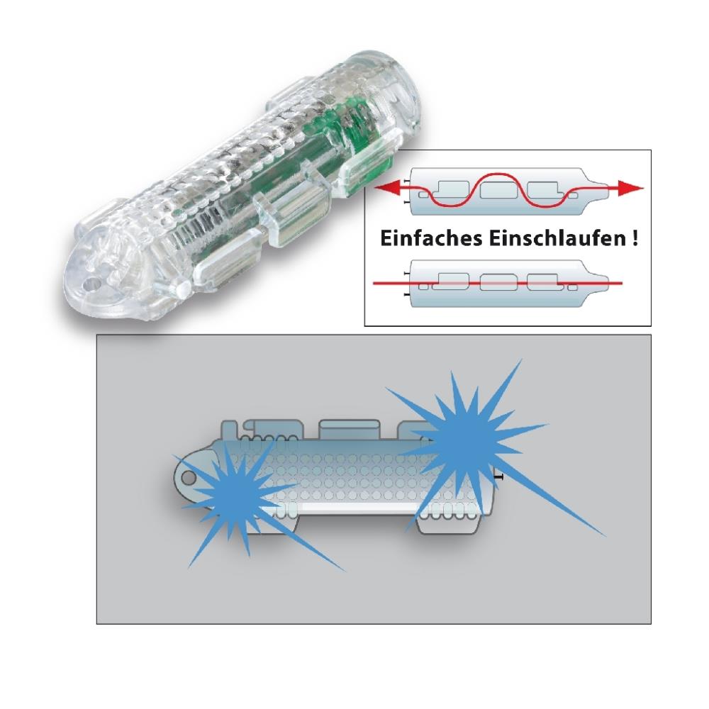 Dies ist ein fängiges Additiv für Vorfächer/Rigs und Montagen. Nur in Verbindung mit Wasser beginnt die Blitzfunktion. Die Blitzdauer reicht weit über 100 Stunden; und somit für viele Angelausfahrten. Das Blitzlicht zieht die Fische in der Umgebung an. Die Montage ist ganz simpel: einfach die beiden bereits vorgeknoteten Clips ins Vorfach einhängen - fertig; - oder das bereits Vorgeknotete abschneiden und in selbst-gebundene Vorfächer montieren. Es stehen vier verschiedene Farben zur Auswahl.