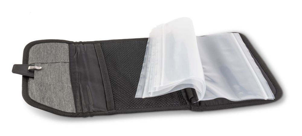 Die Tasche ist mit einem Quick-Lock Hakensystem ausgestattet, das eine einfache Handhabung ermöglicht. Im Inneren befinden sich 6 Zip-Beutel mit den Maßen 22 x 11,5 cm, die perfekt für die Aufnahme Ihrer Gummiköder geeignet sind.