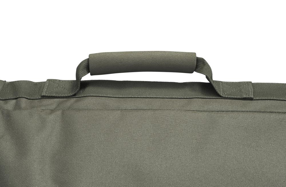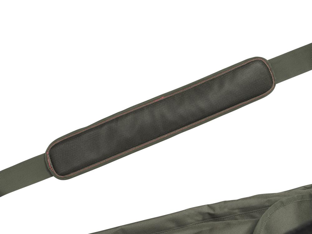 Zusätzlich verfügt das Futteral über zwei große Außentaschen: eine für Brollys und Shelter sowie eine weitere für Buzz Bars (mit Alarmen) und Banksticks. Ein praktisches Taschen- und Riemensystem auf der Außenseite ermöglicht die Unterbringung zusätzlicher Ruten und Kescher. Der gepolsterte Schultergurt und die Webbing-Tragegriffe sorgen für einen bequemen Transport, während die internen Trennwände zusätzlichen Schutz bieten.