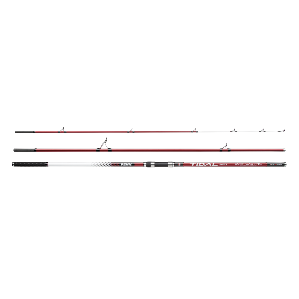 PENN Tidal ist die neue und exklusive Surfcasting Serie von PENN. Tidal Ruten stehen für alles, was man zum Surfcasting braucht: Superstarke, aber leichte und reaktionsfreudige 30T Carbonblanks, die auf beste Distanzeigenschaften ausgelegt sind. Alle Ruten sind mit einer Sensitip Spitze kombiniert, um auch die kleinsten Bisse anzuzeigen. Alle Blanks wurden in Zusammenarbeit mit Surfcasting-Experten in ganz Europa entwickelt, um Ihnen die bestmöglichen Blanks zu bieten - ein unglaubliches Preis-Leistungs-Verhältnis. Die speziellen K-Ringe sind verwicklungsfrei und Salzwasser-sicher, so dass Sie auch bei Wind keine Probleme beim Werfen haben werden. Außerdem sind alle Ruten mit einem komfortablen Shrink-Wrap-Griff und einem speziellen Wurfgriff ausgestattet. Die Rutenserie besteht aus vier einzigartigen Modellen, die sich durch die Farbe unterscheiden - alle sind unterschiedlich stark. Die metallisch silberne PENN Tidal (50-200g) ist für die leichteren Angelstile wie z.B. das Strandangeln oder das Angeln vom Steg aus gedacht, bei denen kein schweres Gerät benötigt wird. Die grün-metallic (100-225g) und blau-metallic (100-250g) Versionen sind echte Allround-Surfcasting-Ruten, die unter allen Bedingungen eingesetzt werden können. Wenn es jedoch auf Weite und Kraft ankommt, ist die metallic-rote PENN Tidal (100-300g) die Rute, die Sie brauchen, um den Job zu erledigen.