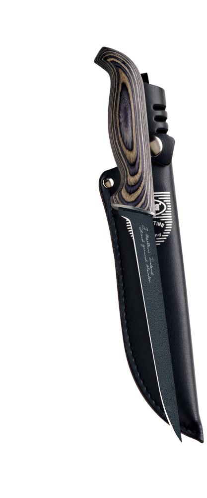 Ein moderner Klassiker dank überholten Nordic-Designs. Brau laminierter Griff mit polierter Edelstahlklinge oder mit grau laminierten Handteil mit PTFE-beschichteter Klinge. Verstaut wird das Messer in einer abgestimmten Echtlederscheide mit Druckknopfverschluss. Die Klinge ist progressiv verjüngt. Für doe volle Kraftausübung besitzt das Messer einen durchgehenden Erl.