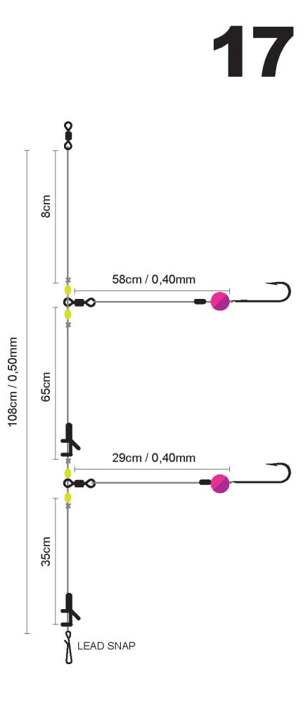 Dieses Vorfach besitzt zwei Seitenarme mit einer Länge von 58cm.Die Gesamtlänge beträgt 108cm. Vor den Haken sind violette Auftriebsperlenangebracht. Die Hauptschnur hat eine Stärke von 0,50mm und die Mundschnüre von 0,40mm. Am Ende des Vorfaches ist ein Impact Shield befestigt. Das Vorfach ist mit unterschiedlichen Hakengrößen erhältlich.