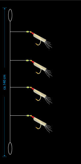 This system is specially designed for coalfish and cod. It features four Maruseigo gold hooks with glitter and a body made of imitation fish skin.