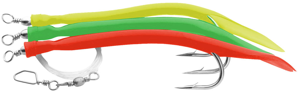 Equipped with three high-quality, pre-tied rubber mackerel lures in the most popular and successful colors, this rig ensures maximum attraction for cod, coalfish, ling, and other predators. Their natural movement in the water and vibrant, signal colors make rubber mackerel lures among the most effective sea baits available.