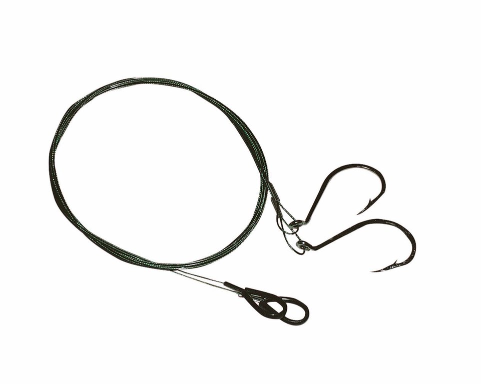 This leader consists of a coated steel leader with grimped eyelets, which is protected by a rubber tube at the upper end. At the other end is a single hook size 9/0, which is also attached with a crimp connection.