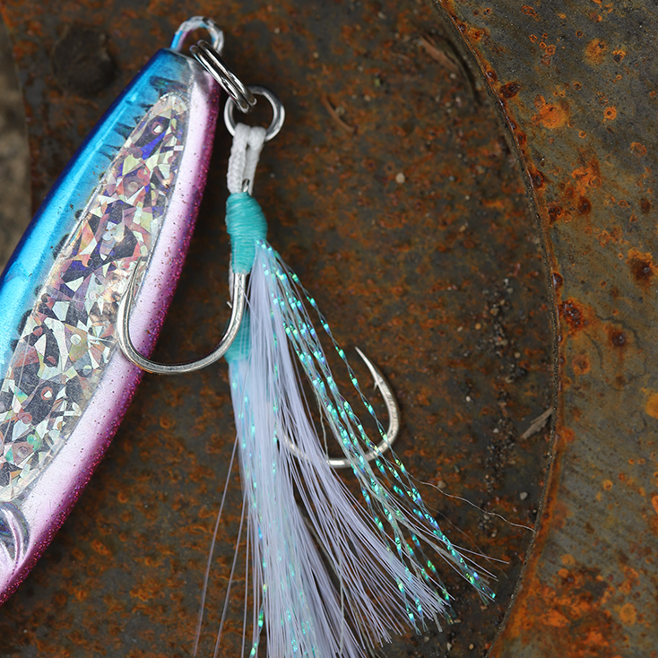 - Double Assist Hook Design: The double assist hook design increases the likelihood of the hook penetrating the fish's muscle tissue and allows anglers to use different rigging options and orientations of the hook to optimize the presentation of the jig in different scenarios.
