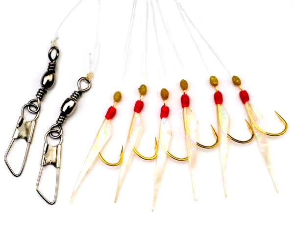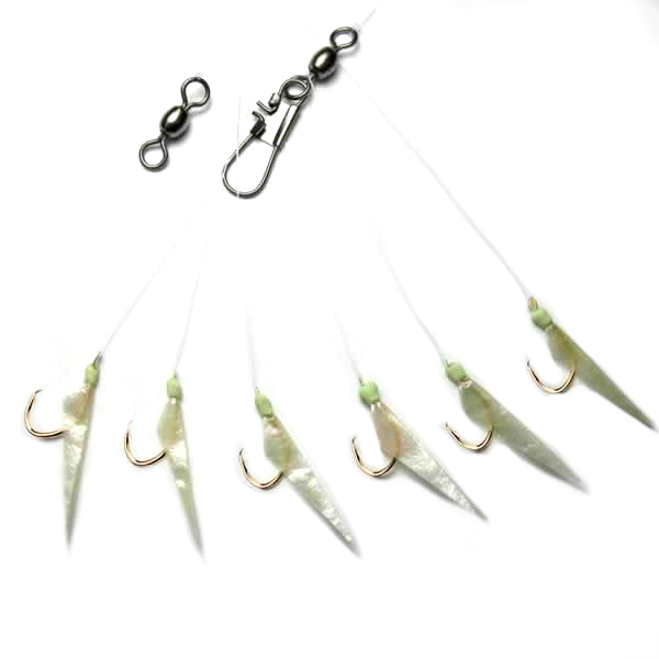 These mackerel and herring systems have six hooks decorated with real fish skin and self-luminous beads. They are tied to Fluoro-Carbon line. This high performance line is Made in USA. The hooks have a size of 4 or 6. Model 2 has circle hooks.