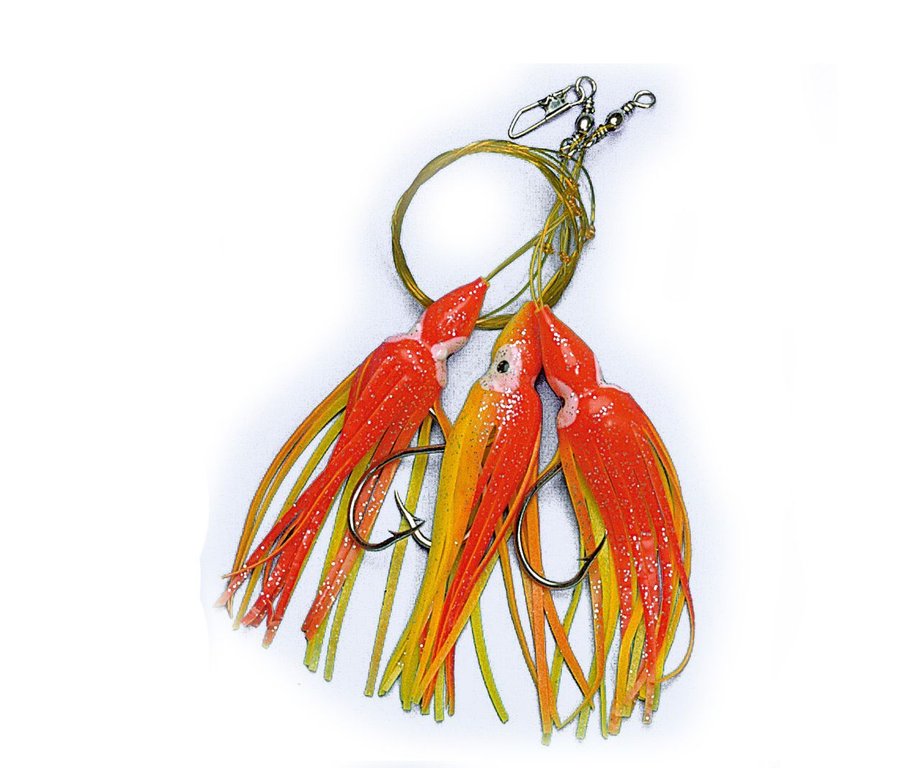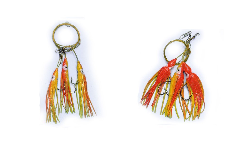 This leader is available in two different versions with hook sizes 6/0 or 7/0. The total length is 1.45m, and the monofilament line used has a diameter of 0.70mm. The yellow-orange octopuses are 12cm long.