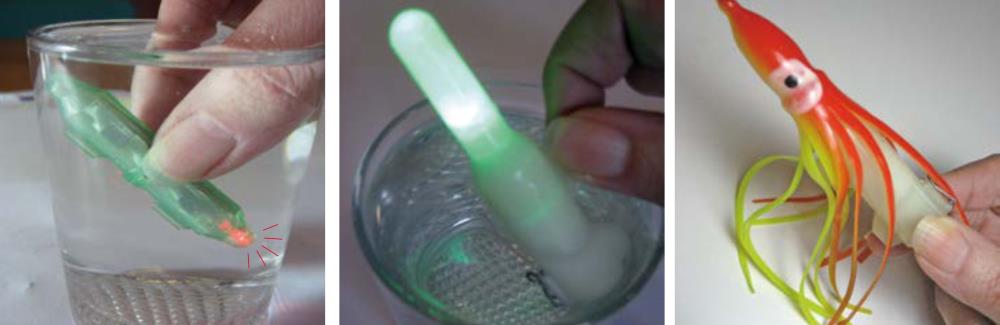 It has a line guide channel and can therefore be easily threaded onto the fishing line. There are several colour combinations to choose from. The glow time (with continuous flashing) is up to 100 hours. The light radius, depending on the water depth, is up to 25 m. We mainly fished in water depths of up to 50 m.