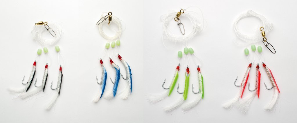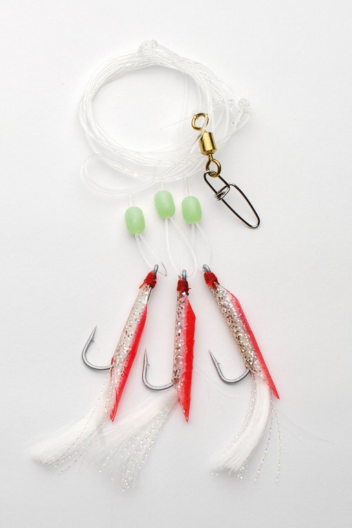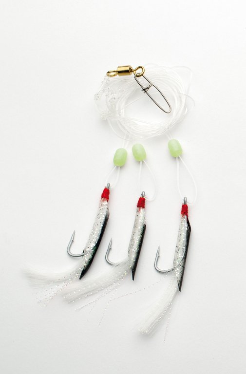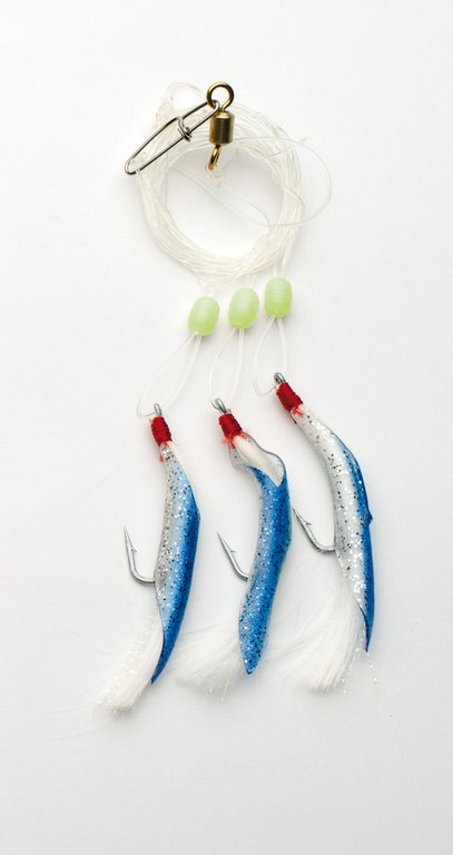 This strong system consists of three size 5/0 hooks decorated with rubber tubing and tinsel. Four different colors are available. It uses 0.80mm monofilament line. The rig is 1.50m long, with 10cm side arms.
