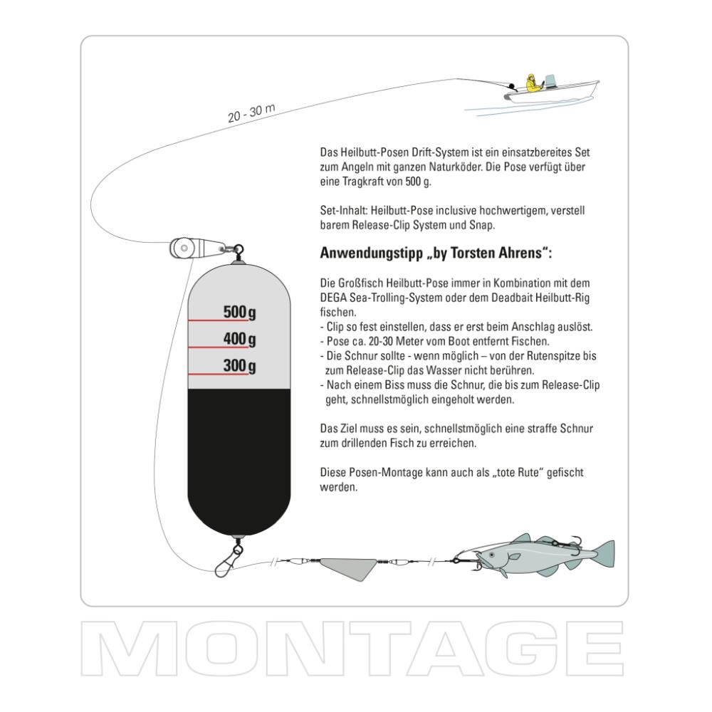 Application: Always fish the big fish Halibut Pose in combination with the DEGA Sea Trolling System or the Deadbait Halibut Rig. Set the clip so tight that it only releases when the fish is struck Fish the float approx. 20-30 meters from the boat The line should - if possible - not touch the water from the rod tip to the release clip After a bite, the line that goes to the release clip must be retrieved as quickly as possible. The goal must be to achieve a tight line to the drilling fish as quickly as possible. This float assembly can also be fished as a "dead rod".