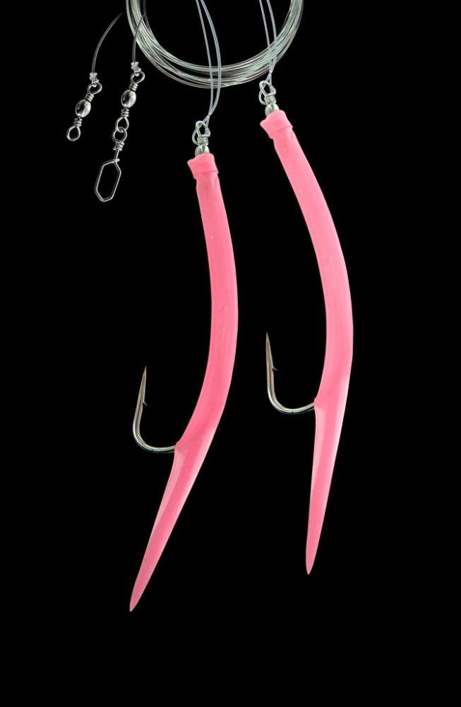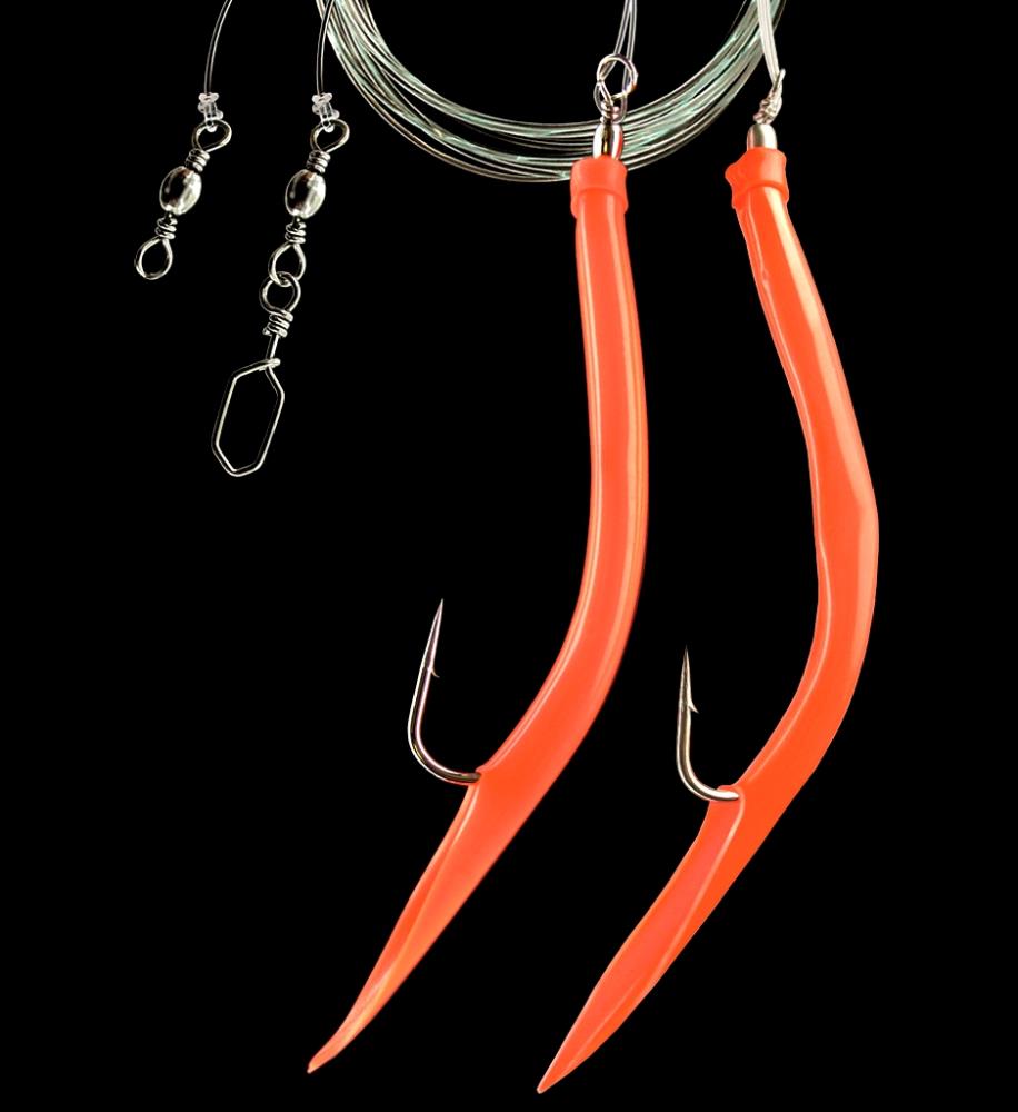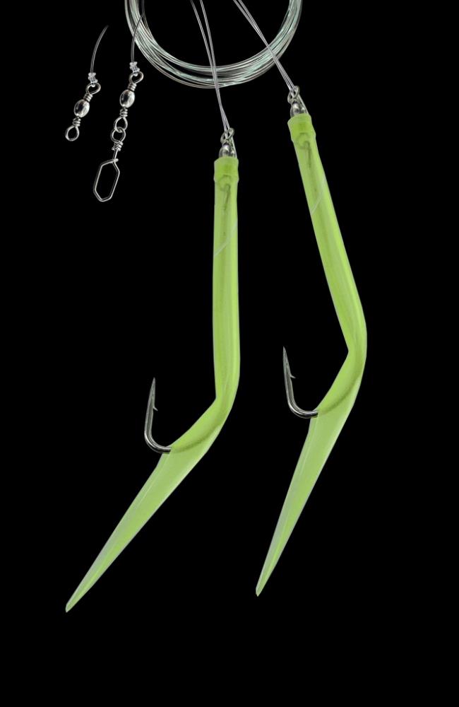 This fully assembled sea rig features a strong luminous rubber makk. It has 2 side arms and a length of 100 cm. Three sizes from 8/0 to 12/0 and three colours are available.