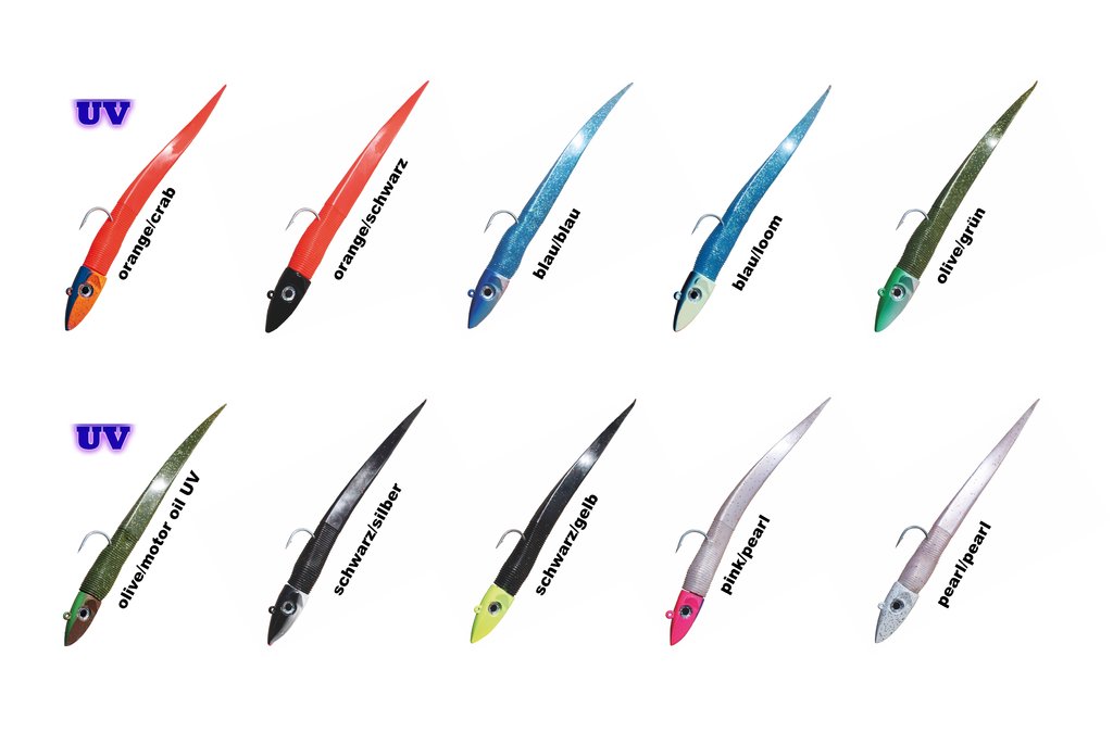 Halibut is the core competence of the draufganger, big pollacks, cod and coalfish he catches just as successfully on the side job - you can bet on it. In the tests in Norway, we mainly caught the big halibut on the draufganger. UV blue is ideal for deep WAsser, Japan red is great for cod, halibut like pearl white, saithe like black baits and capital pollack like motoroil.