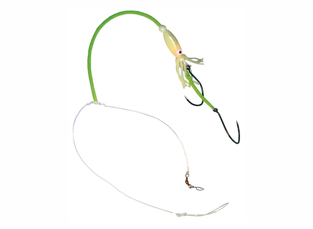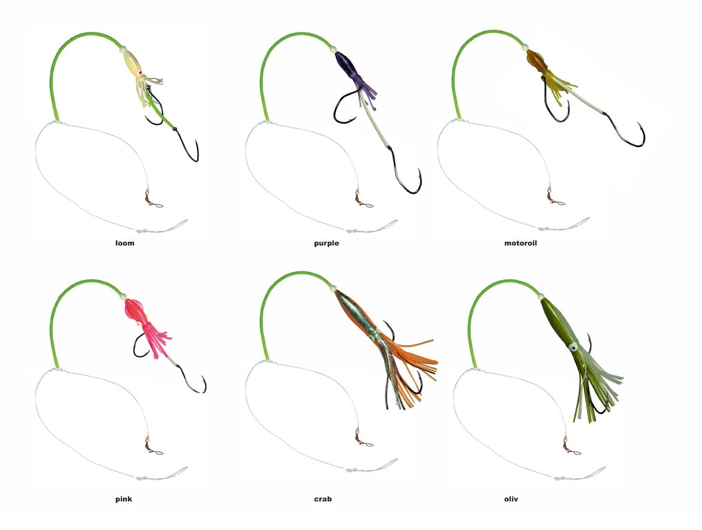 Enrico Wyrwa builds this special system on Hitra to get the big ling on the hook. Extra strong materials, a string connection without knots - in one piece. The 1.20mm thick monofilament line is double tied and is protected by the light protection tube. It couldn't be safer! In contrast to System II, this system has two single hooks of size 10/0 on which a fish fillet is presented. Because the ling is very suspicious and only likes the bait if it is offered almost natural. The fillet should be mounted like a palm of the hand so that it flutters in the water like a fish. A simple lump of meat is often spurned. There are six different colours and two different octopuses as B2 with 10cm (all other colours) and Hogy octopuses (oliv+crab) of size 20cm. At the end of the leader there is a strong safety swivel of size 3/0. For production reasons it can happen that the colours of the octopuses vary slightly.