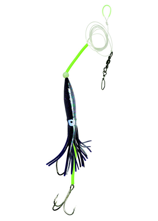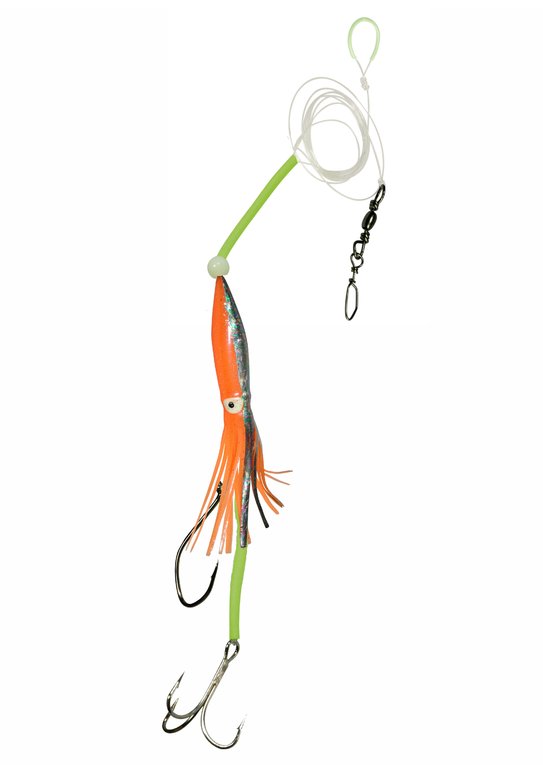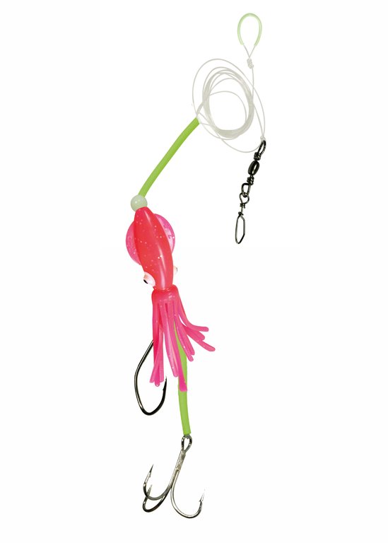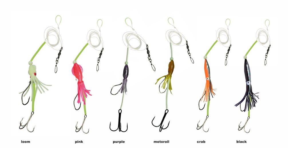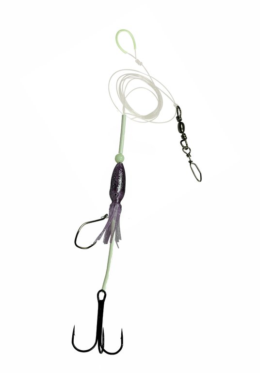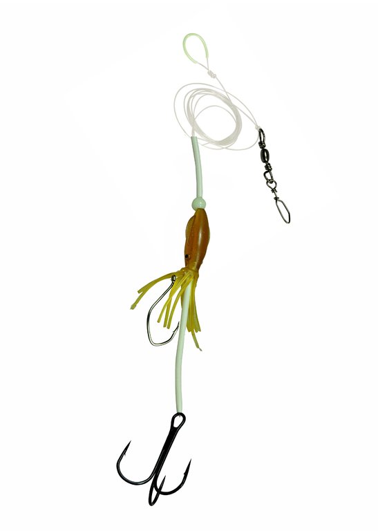 These leaders have been developed for large hake. They have one bite point, which is equipped with two hooks for whole baitfish. The single hook and treble hook are size 6/0. Compared to the ling system, which is also available, the leader is more discreet and designed for open water, as the hake is faster, more aggressive and wilder. The high-quality hooks are attached to a 1.20 mm thick monofilament line. They also have a strong size 3/0 safety swivel and fluorescent tubes to protect the leader from the sharp hake teeth. The leader is available in six versions, which differ in the color and shape of the octopus. Two variants have 10cm long B2 octopuses in the colors pink and loom. Two others have 10cm B1 octopuses in purple and motoroil and the remaining two 10cm long Hogy octopuses are available in black/green or crab. The colors of the octopuses can also change.