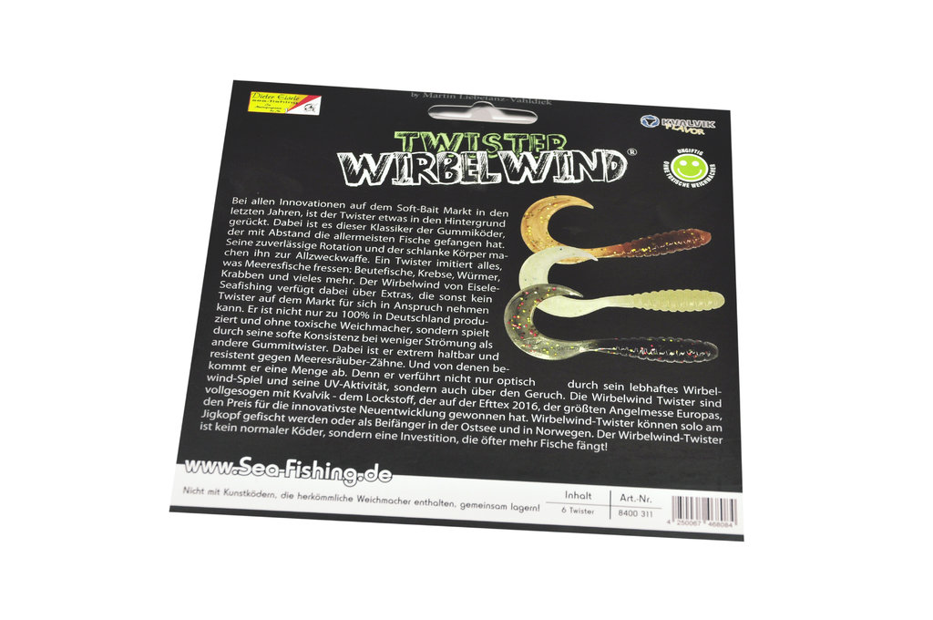 The Twister is an all-purpose tool for catching fish. This lure boasts a variety of features that distinguish it from other lures on the market. It is 100% made in Germany and contains no toxic plasticizers. The Wirbelwind is very enticing even in light currents, thanks to its soft consistency. It is nevertheless very durable and resistant to the teeth of predators. It entices them not only with its UV activity but also with its odor. The Twisters are saturated with the revolutionary attractant Kvalvik. The Wirbelwind Twister can be fished solo on a jig head or as a side bait in the Baltic Sea and Norway. The many advantages of this lure speak for themselves. The Twisters are available in two versions, each offered in three different colors.
