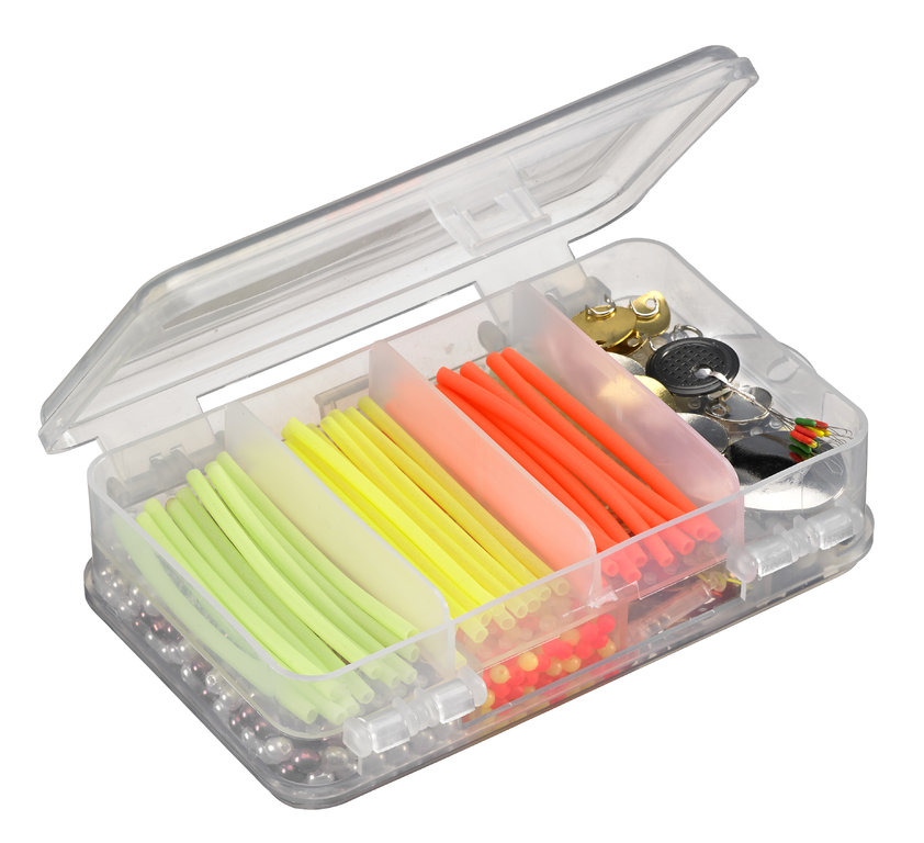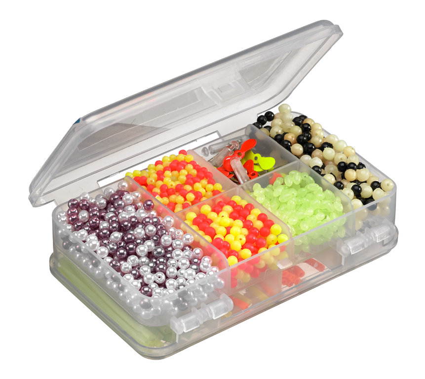 This rig accessory set comes in a practical, clear box that opens from both sides. The assortment contains approximately 900 pieces, including various hard and soft beads, spinner blades, propellers, light tubes, and rattles. This box has almost everything you could want.