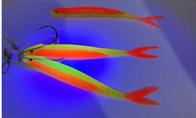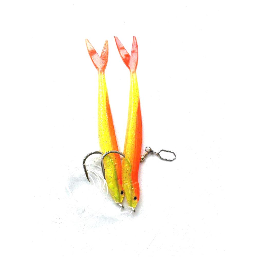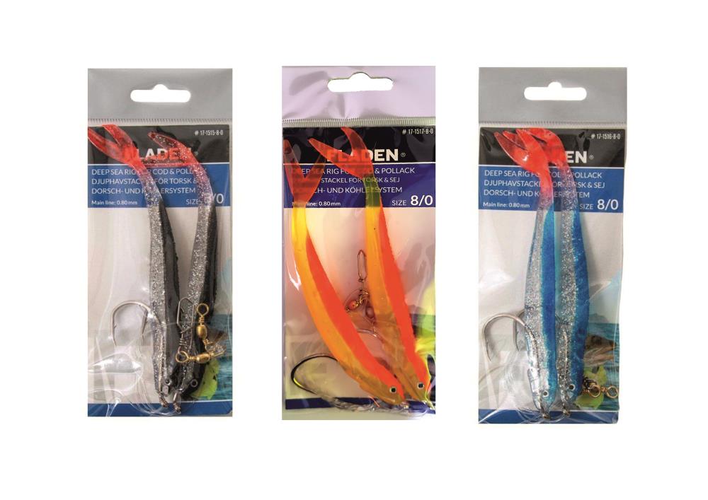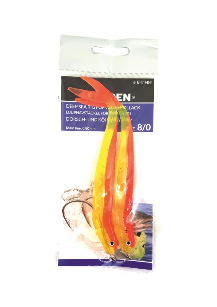 This twintail rig consists of two long rubber fish (14cm) that imitate sand eels. They are mounted on size 8/0 hooks and attached to a 0.80mm monofilament main line. This leader is available in the colours blue-glitter, yellow-red and black-glitter. It is ideal for catching cod and saithe.