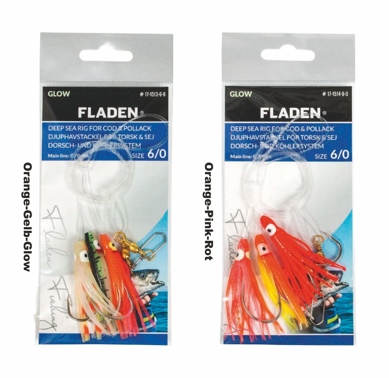 This cod and coalfish rig is available in two colour variants and hook sizes. On the one hand, the colour combinations orange-yellow-glow or orange-pink-red are available and on the other hand, they are available in hook sizes 2/0 and 6/0. The line thickness is 0.60mm for hook size 2/0 and 0.70mm for size 6/0. At each rig there are 3 mini octopuses.