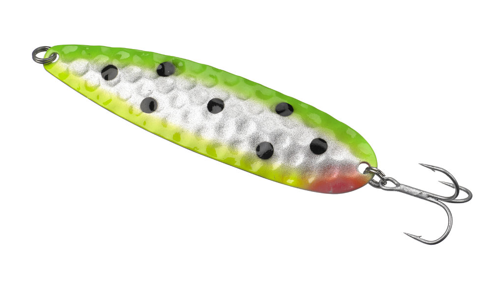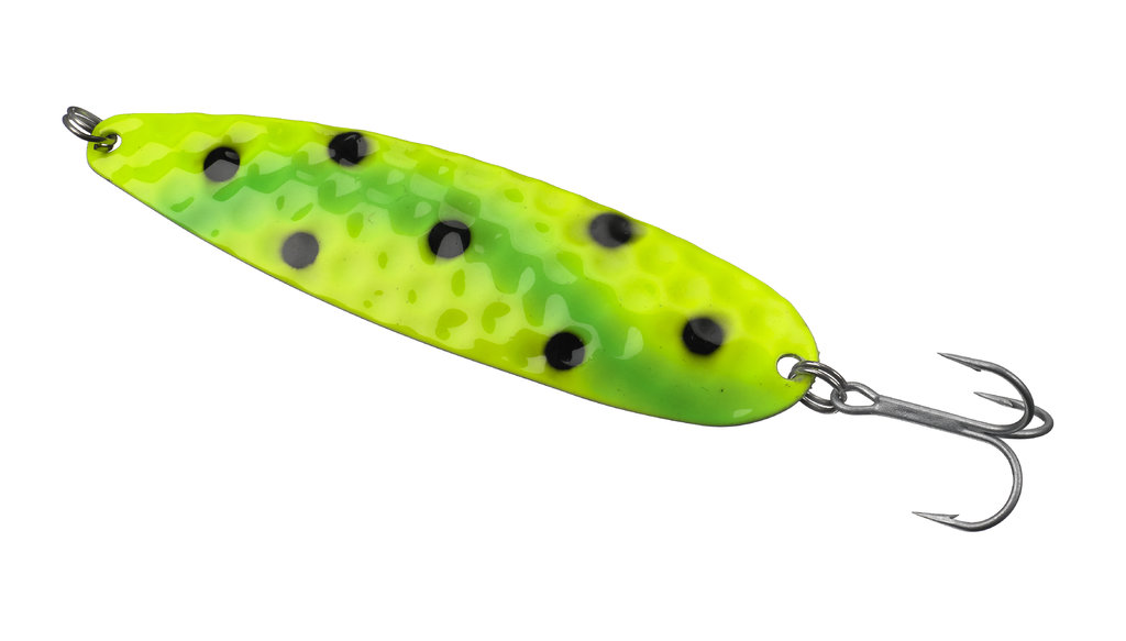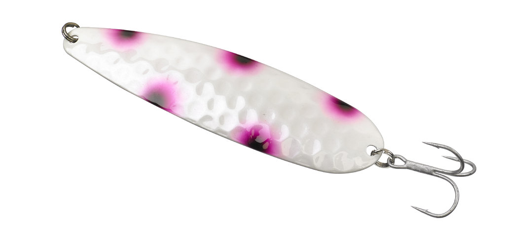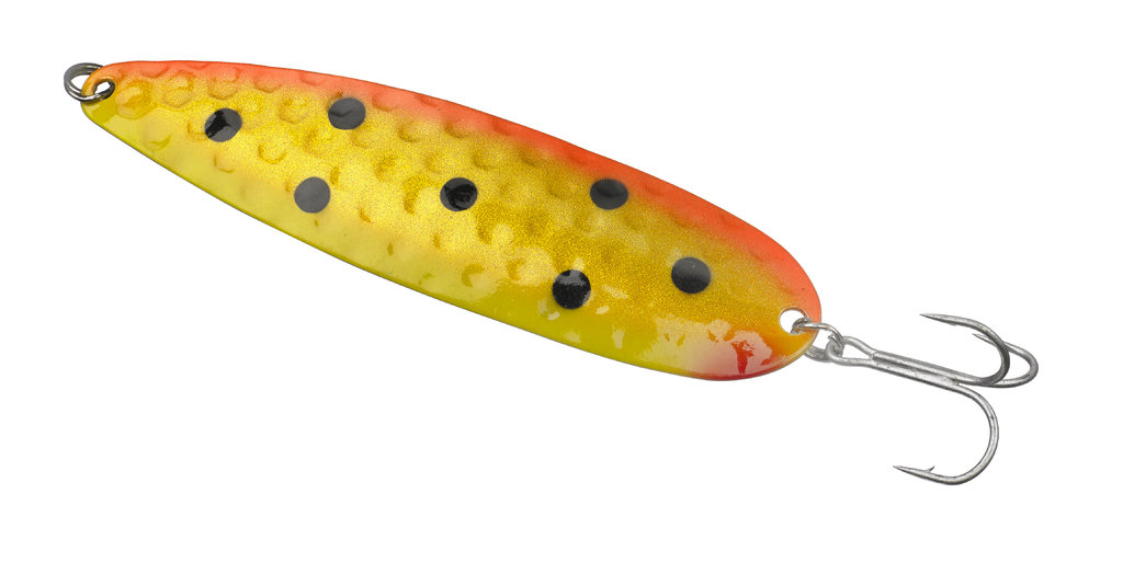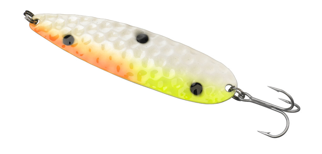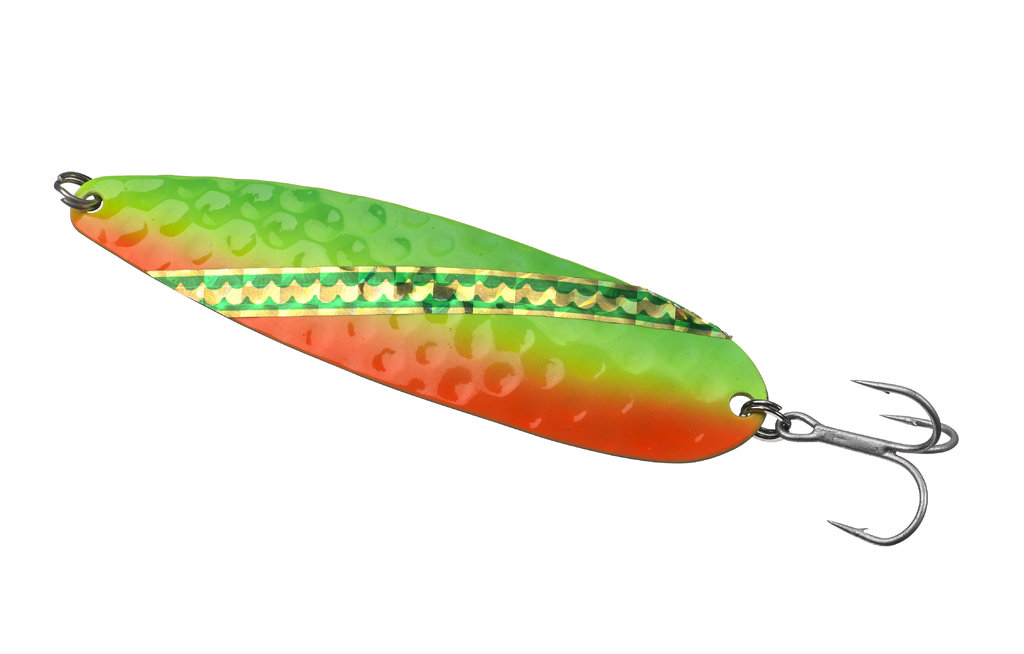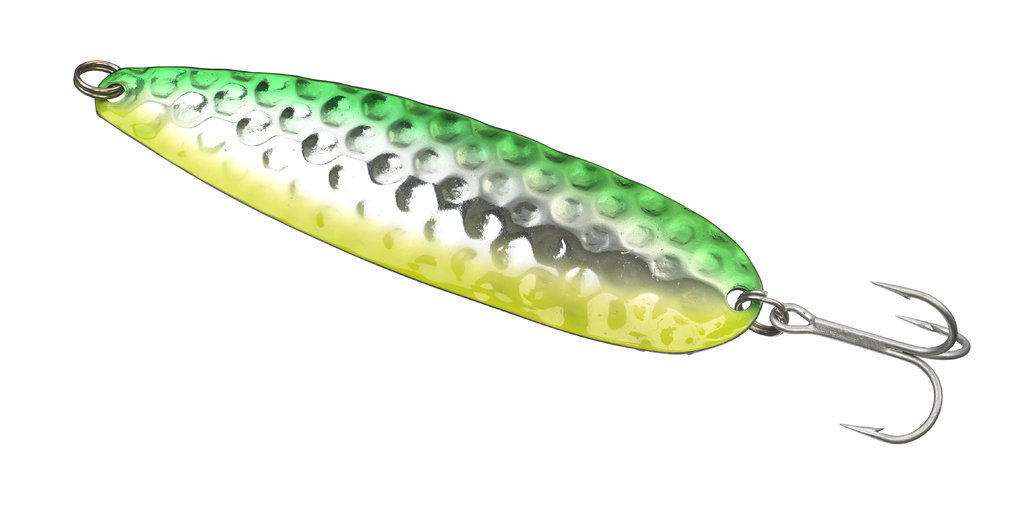 FLADEN SIMRIS is a fantastic trollingspoon with high speed tolerance. It if works perfect for speed between 1.8 - 2.8 knots. For slower action fish it as it is. For more sweeping action move the upper splitring to the hook and fish double rings to the hook. Change the action by bending it slightly. Availible in eight different colours and two lengths with weights of 16g and 26g.