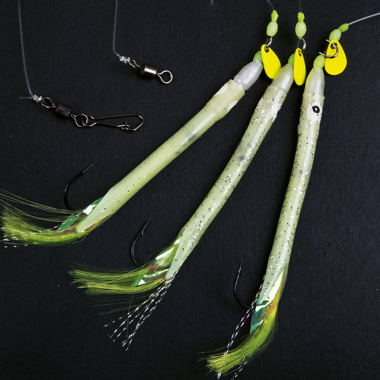 This rig is offered in different sizes. It has 3 hooks. The hook size ranges from 1/0 - 12/0. A separate spinner blade is mounted in front of each hook. The hooks have feathers and luminous tubes. The length of the leader is 110cm and has a diameter of 0.50mm - 0.80mm depending on the hook size. This leader is ideal for cod and coalfish, but mackerel love it too. The different sizes allow you to adapt it individually to different conditions.