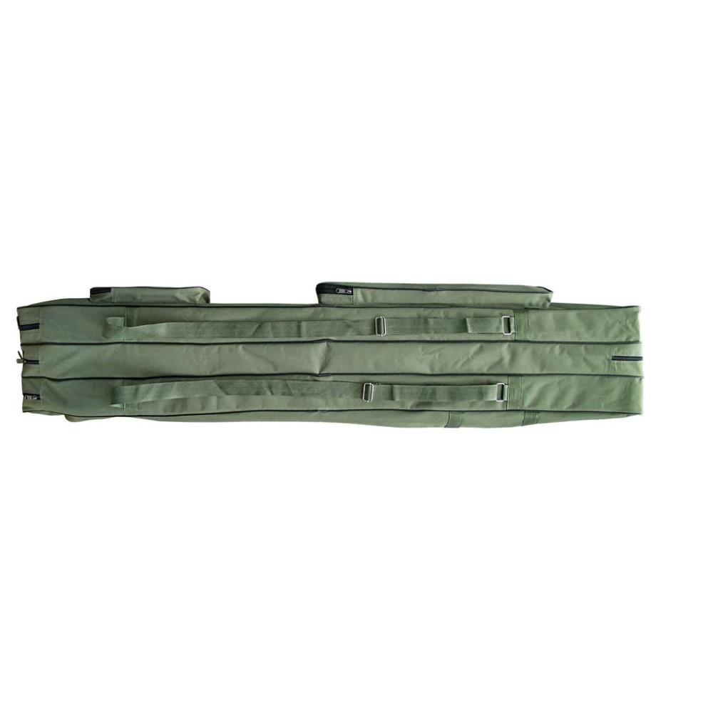 This rod case is ideal for transporting fishing rods. Thanks to the 3 separate compartments with zip and reel recess, 3 to 5 mounted rods with reels can be easily transported. In addition, the rod bag has 2 spacious outer pockets for accessories such as rod holders as well as two shoulder straps (carrying function as a backpack) and additional carrying handles. Available in two different lengths.