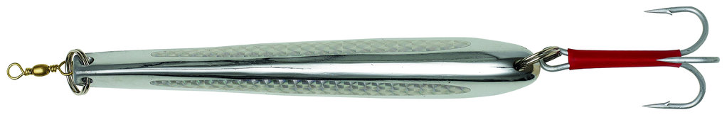 The silver finish creates strong light reflections underwater, making the jig particularly effective in clear conditions, sunlight, or mid-water.