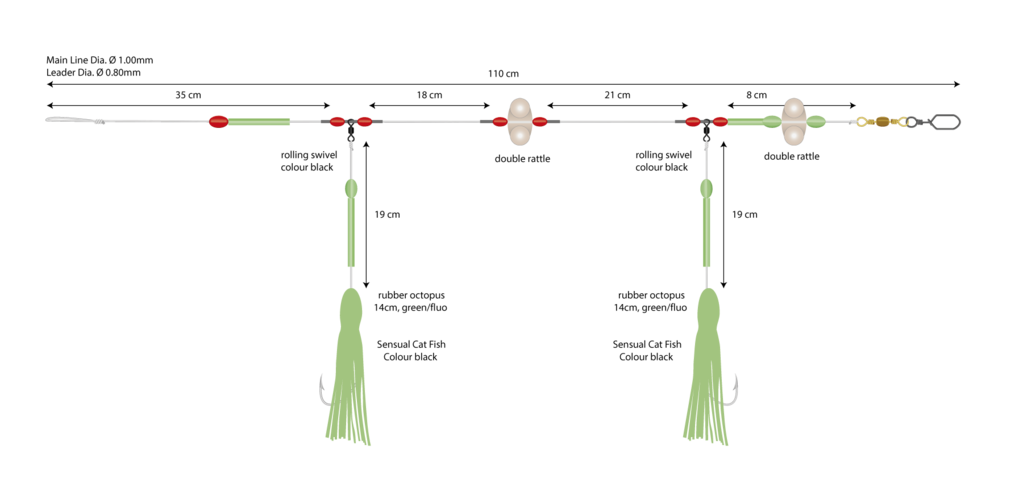 This system offers all kinds of refinements, such as the fluorescent octopuses, the rotating rattles and the luminous tube. This means that the leader appeals to several of the catfish's senses. The finished leader is attached to the main line, loaded with lead and tapped on the bottom, i.e. the lead is placed jerkily on the bottom. The bottom is tapped with weights of 300g - 800g.