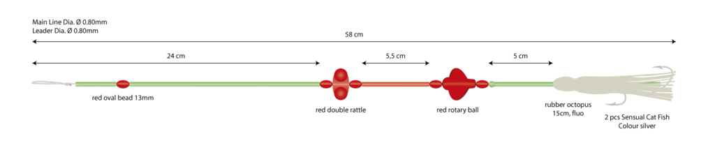 The rig has two hooks for fishing with fish fillets and small bait fish. It has a rotating rattle and turbine, as well as a very natural, transparent octopus. In addition, a luminous tube protects the line and increases the attractiveness. The rig is suitable for cod, saithe and ling at depths of 50 to 300 metres. Due to the hook arrangement, whole bait fish can also be used. The octopus moves very seductively in the current and is almost indistinguishable from a real octopus. This rig is ideal for medium and strong currents. It is fished on a running sea boom and, in weak currents, on a metal boom. A stop must be set with this leader. The length of the leader is 58 cm with a line diameter of 0.80 mm.
