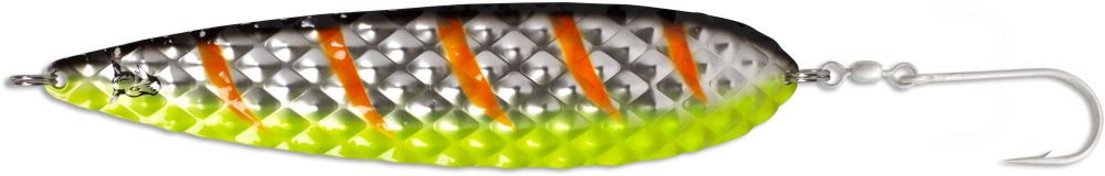 This is a new spoon for large salmon. Due to its size of 165mm and the slightly higher dead weight (compared to usual dragging spoons) of 40g, the Salty Diamond spins seductively whenever the speed is reduced a bit. This usually happens due to the influence of waves or on the inside when cornering. This special series was developed especially for capital hiking salmonids with the cooperation of Peter Cernold (Team 4Reels Sweden) and Mike Luner (Team Beluga Germany). The two specialists have based their colouring on the most successful patterns in Scandinavia and Germany (Rügen). The indicators are mounted with a large single hook, which guarantees an optimal hook fit, as many professionals use it for targeted salmon fishing. The spoons are UV activ.