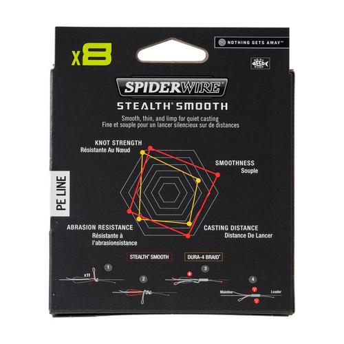 Introducing the Spiderwire Stealth Smooth 8x8 PE Braid - a super soft and silky smooth x8 braided line that makes no compromises when it comes to strength, sensitivity or diameter. Tightly braided with 8 strands of PE fibres, Stealth Smooth brings the unmistakable Spiderwire feel and performance to the arenas of saltwater showdowns - be it hunting giant halibut in the Arctic depths of Norway or catching fast savages in the warm waters of the Mediterranean. The supple feel of the braid helps it cast long distances with ease, while the x8 core offers incredible strength to tame any deep-sea monster. The line is also coated with a thin layer of high-strength microcrystalline polymer, which helps to keep the diameter thin and also ensures that knots are easy to tie and stay tight. The line has five bright colours that change in 10 metre sections so you can easily determine depth when slow jigging, vertical jigging or reef fishing.