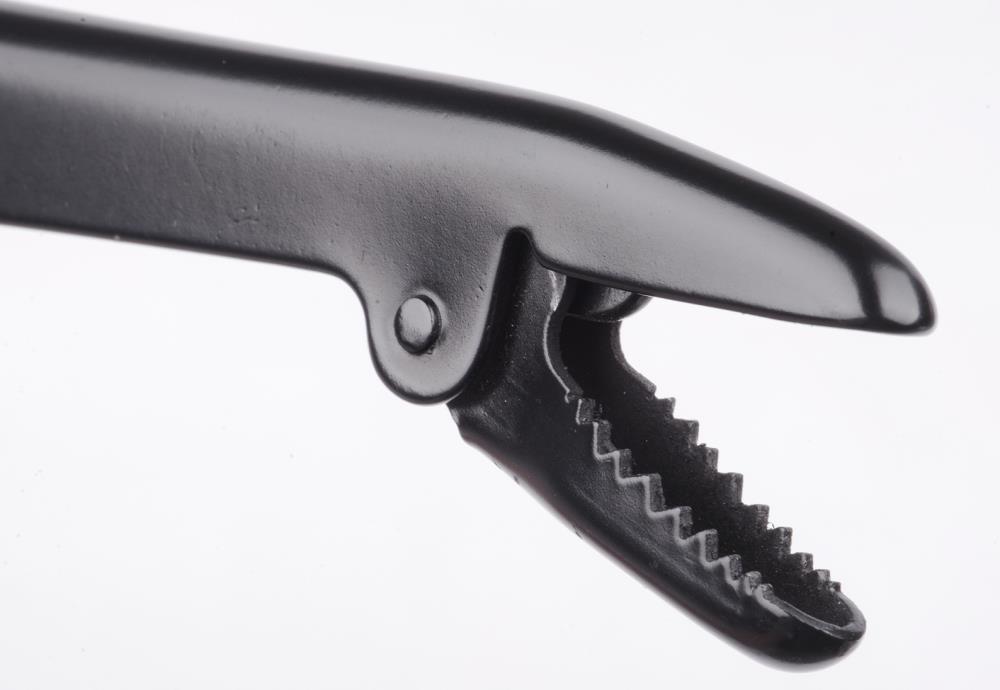 This stainless steel, "Straight Jaw" hook remover holds strong hooks and treble hooks very securely and removes them very easily from the fish. The unique TPR handle has a comfortable, non-slip grip. We have fitted this hook remover with an adjustable safety line to prevent it from going overboard.