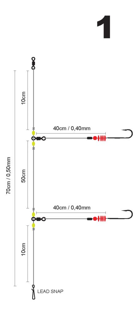 This leader has two side arms with a length of 70cm. The side arms have a length of 40cm. The main line has a thickness of 0.50mm and the mouth lines of 0.40mm. There are red leaves and a red bead in front of the hooks. The leader is available with different hook sizes.