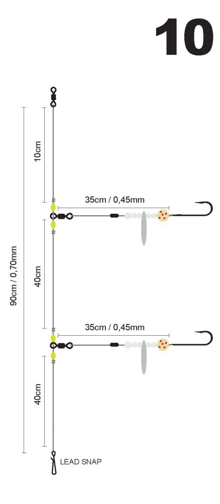 This leader has two side arms with a length of 90cm. The side arms have a length of 35cm. Self-luminous buoyancy beads, a spinner blade and pearl-coloured beads are attached in front of the hooks. The main line has a thickness of 0.70mm and the mouth lines of 0.45mm. The hooks have a size of 1/0.