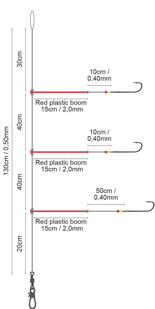 This leader consists of three side arms that are attached to plastic booms. The leader is 130cm long and consists of a 0.50mm thick monofilament main line. The hooks of the side arms are attached to a 0.40mm or 0.35mm (size 4 + size 6) thick line. The leader is available with different hook sizes.