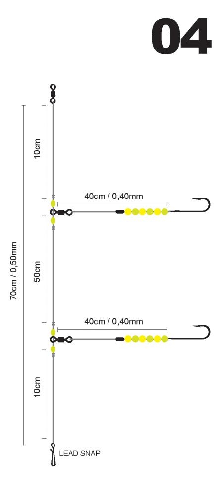This leader has two side arms with a length of 70cm. The side arms have a length of 40cm. The main line has a thickness of 0.50mm and the mouth lines of 0.40mm. There are citrus-coloured beads in front of the hooks. The leader is available with different hook sizes.