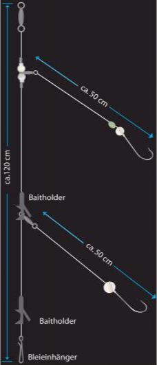 The rig's total length is 120 cm, perfectly suited for surfcasting with natural baits. The robust 0.70 mm main line withstands surf and currents, while the finer 0.30 mm dropper line gives the bait a lively action.