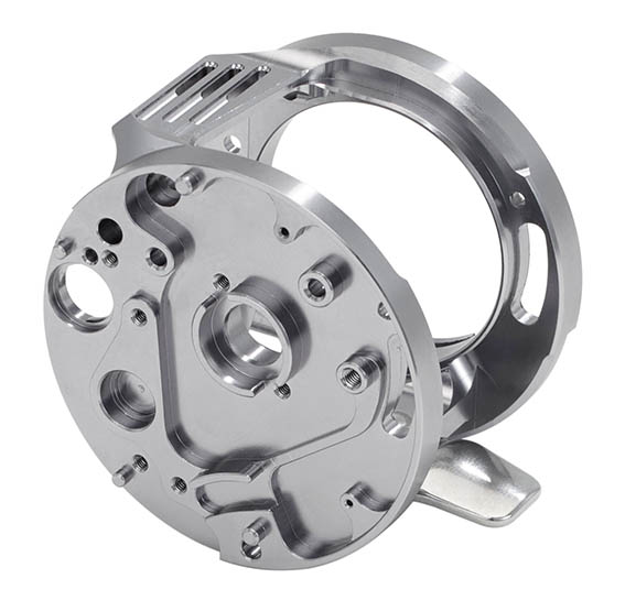 - Frame, side cover and spool CNC-milled from one piece of aluminum