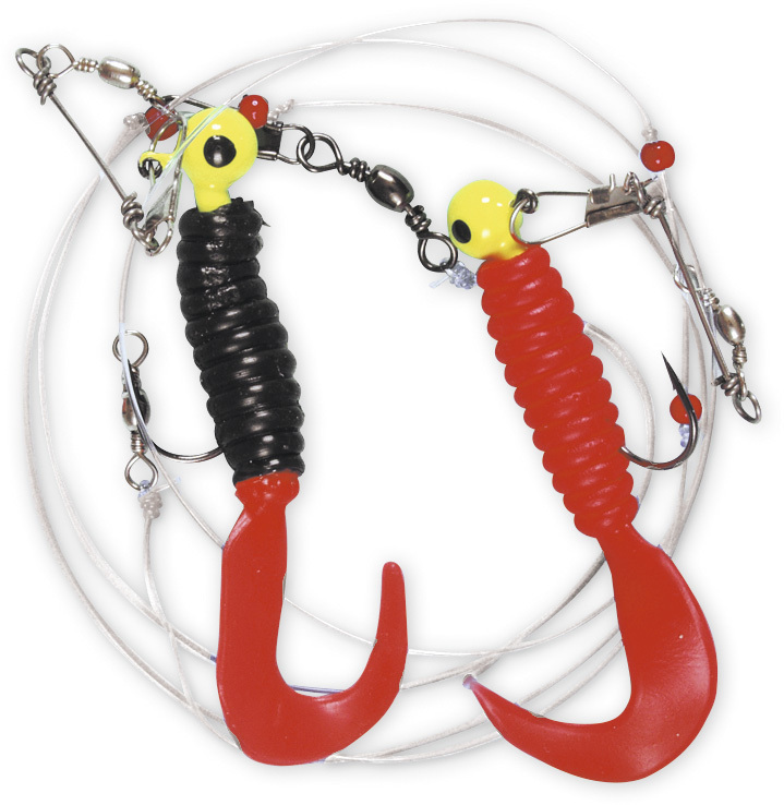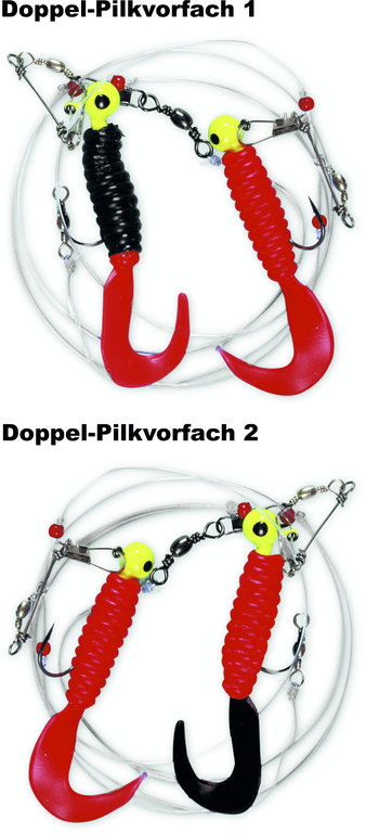 This double twister rig consists of two red 6.5cm twisters, which are mounted on a 0,65mm thick line. The leader is attached to a 0.70mm thick main line. The hook size of the leader is 3/0.