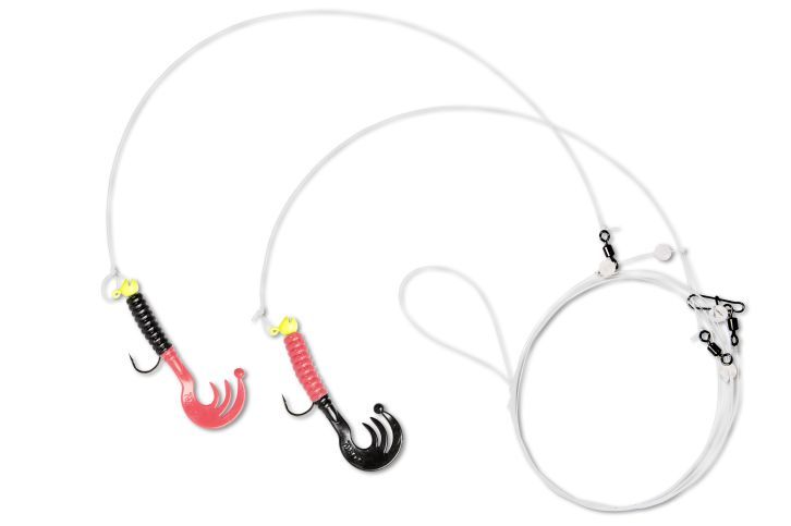 This special leader has been designed for catching whiting. There are two different versions. The difference between the two versions is the distance between the side arms and the distance to the swivel. The first version is divided 50/50, which means that the distance between the two side arms and the swivel is 50cm. In the second version, 40/60, the distance between the side arms is 60 cm and the distance to the swivel is 40 cm. Both leader versions have a 0.50 mm thick main line and the side arms are 0.45 mm thick. The load capacity of the leaders is specified as 17 kg. The twister tails are available in four different colors. The twisters with curly tails are 5.5 cm long and are attached to a 2 g Trophy LOOky jig head with a hook size of 1. The leaders are 135 cm long and the side arms are 23 cm long.